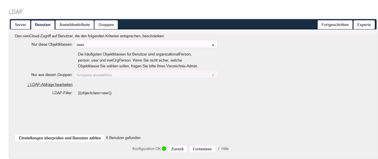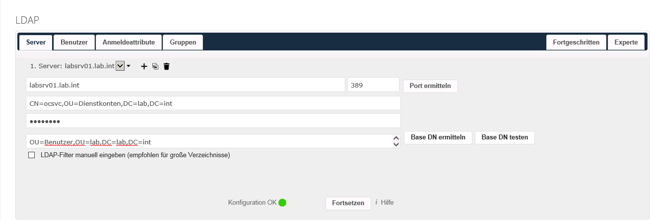 Klicken Sie auf Base DN ermitteln um das User Verzeichnis erkenne zu lassen;