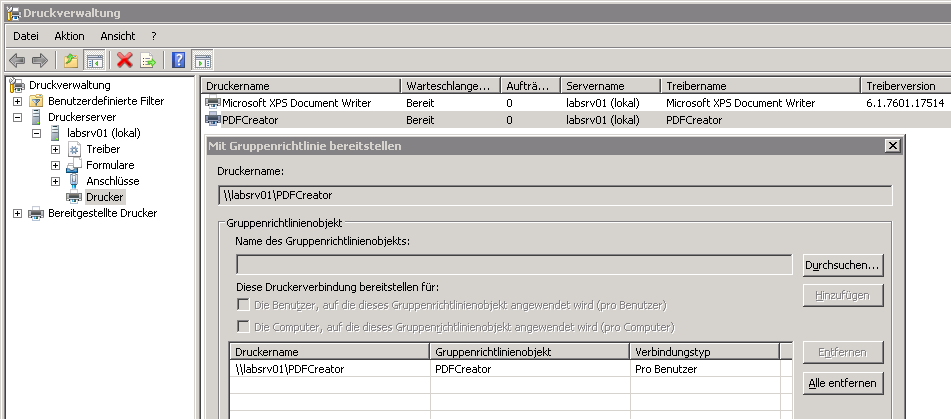 Geprüft werden kann dies durch folgenden aufruf: \\<Printservername>.<Domain Endung>\pdfcreator - Nach der Zuweisung auf die AD Gruppe, prüfen Sie die Notwendigkeit der Point2Print Anpassung an Ihre Domäne!
