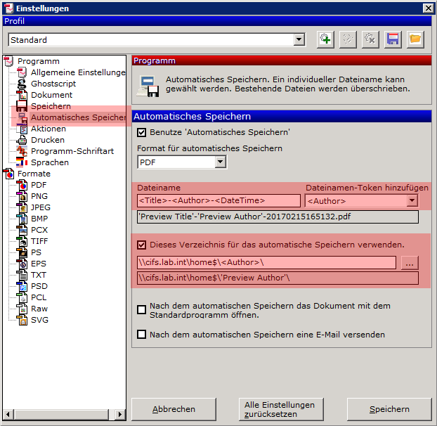 Pfad HKEY_LOCAL_MACHINE\Software\Wow6432Node\PDFCreator\Program Schlüssel PrinterTemppath (Wert: auf dem PrintServer ein gesondertes Verzeichnis) - Öffnen Sie die Optionen des PDFCreators und aktivieren Sie den Punkt Automatisches Speichern (Eng. Auto-save). Setzen Sie folgende Werte ein (Hinweis Benutzerprofile):