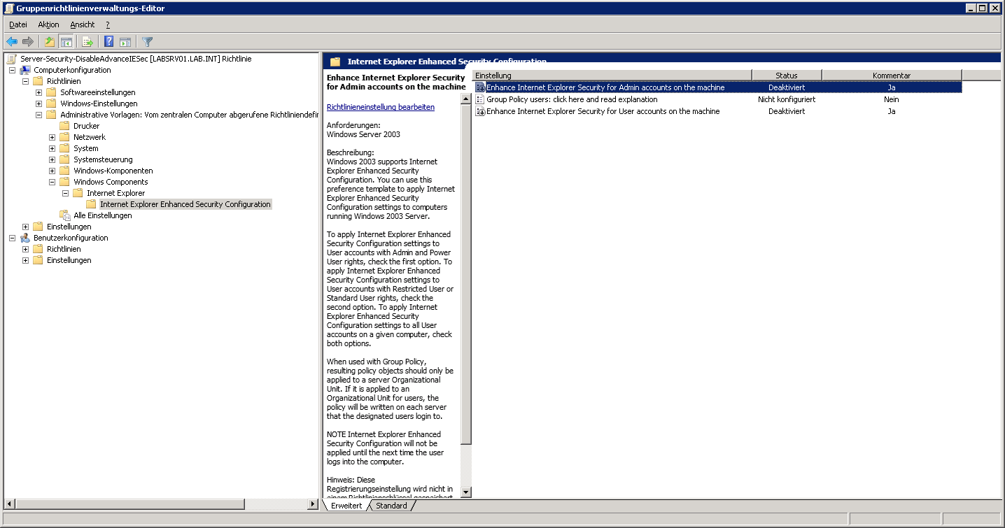 Pfad Computerkonfiguration > Richtlinien > Administrative Vorlagen… > Windows Components > Internetexplorer > Internet Explorer Enhanced Security Configuration Schalter 1 Enhance Internet Explorer Security for Admin Accounts on the machine Schalter 2 Enhance Internet Explorer Security for User Accounts on the machine