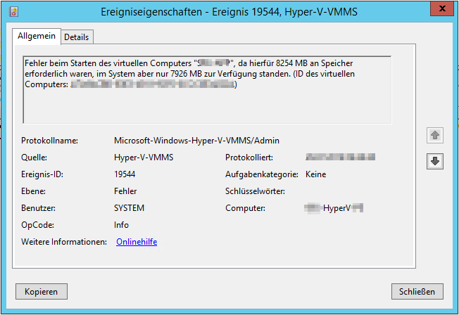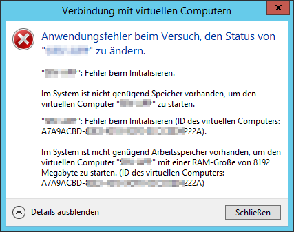 Beim Wiederherstellen der Stromversorgung und beim Versuch die VMs zu starten erscheint die Meldung, dass nicht genügend Speicher zum Start zur Verfügung steht.