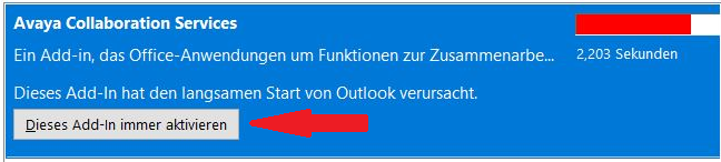 - Schalten Sie im neu erschienen Fenster das Avaya Addin für Outlook ab.