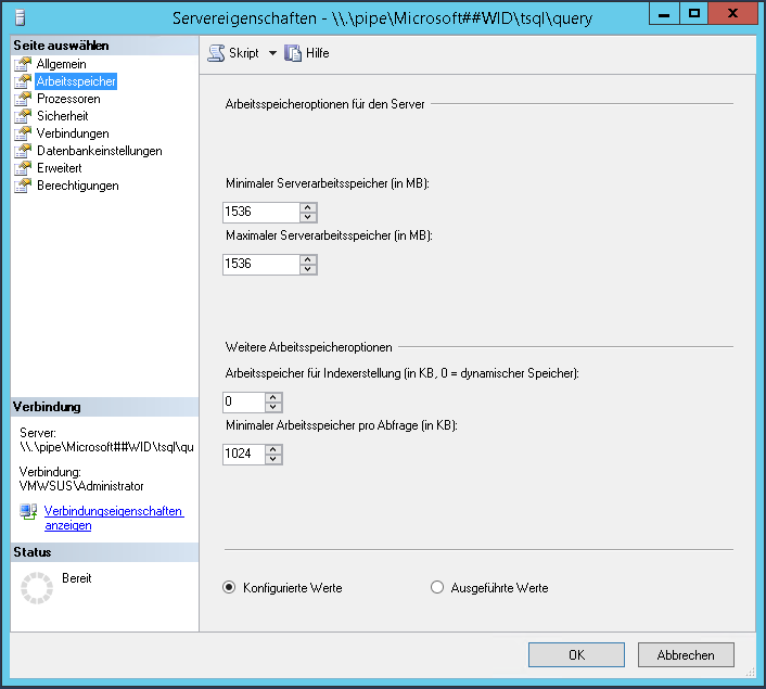 - Setzen Sie unter Maximum Server Memory den Wert für 1,5GB (1536 MB) ein.