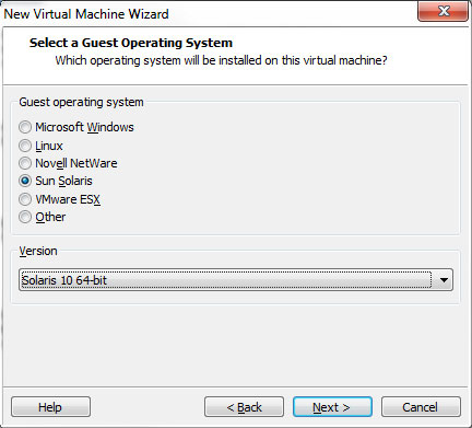 - Bei der Auswahl des "Guest Operating Systems" wählen Sie "Solaris 10 64-Bit" aus.