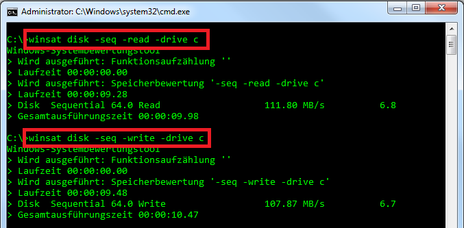 | winsat disk -seq -write -drive c | Mit diesen Befehl ermitteln Sie die Schreibgeschwindigkeit |