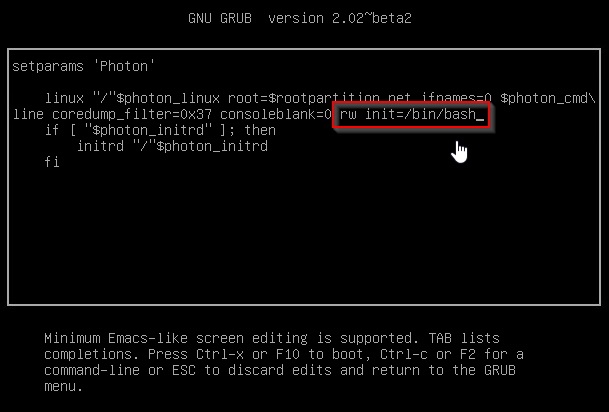 - Tragen Sie hinter der ersten Zeile " consoleblank=0" folgenden Wert ein: rw init=/bin/bash